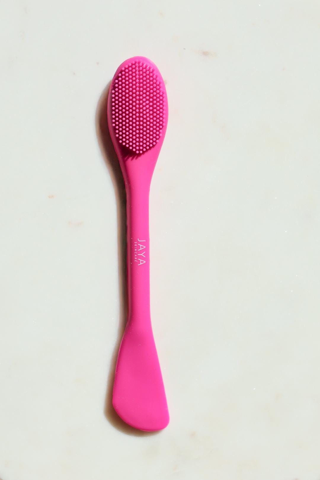 Dual-ended: flat flexible applicator + soft bristle cleansing/massage brush