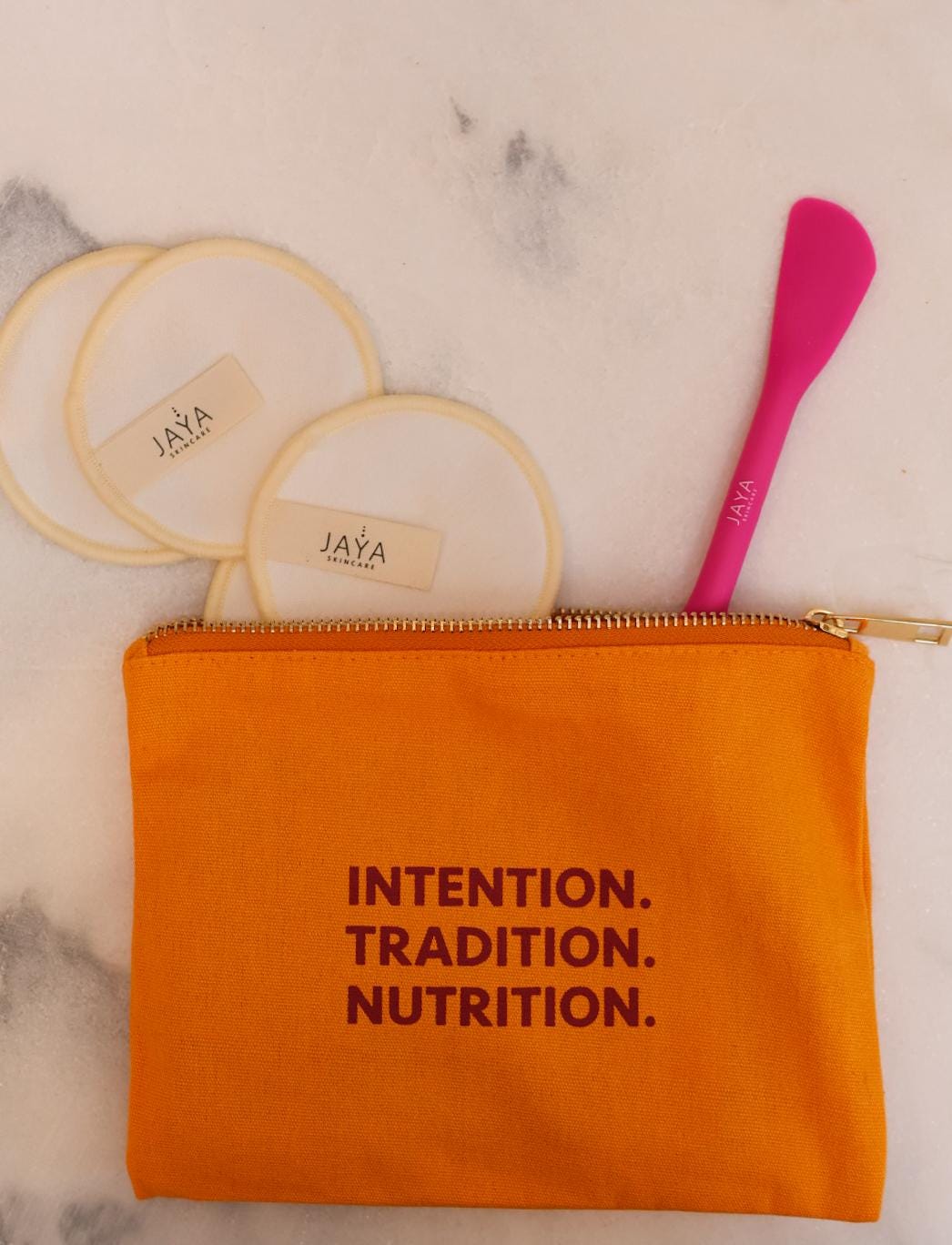 Canvas Cosmetic Pouch – Mustard yellow cotton canvas with a luxe gold zipper; JAYA’s mantra INTENTION. TRADITION. NUTRITION. on the front and JAYA Skincare logo on the back (20 × 15 cm).